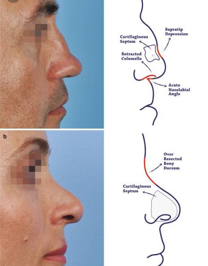 Saddle nose is a condition associated with nasal trauma, congenital syphilis, relapsing polychondritis, granulomatosis with polyangiitis, cocaine abuse, and leprosy, among other conditions. The most common cause is nasal trauma. It is characterized by a loss of height of the nose, because of the collapse of the bridge.