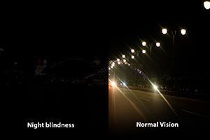 Night blindness (nyctalopia) is your inability to see well at night or in poor light such as in a restaurant or movie theater. It is often associated with an inability to quickly adapt from a well-illuminated to a poorly illuminated environment. Night blindness caused by nearsightedness, cataracts, or vitamin A deficiency is treatable. Corrective lenses, such as eyeglasses or contacts, can improve nearsighted vision both during the day and at night. Let your doctor know if you still have trouble seeing in dim light even with corrective lenses.