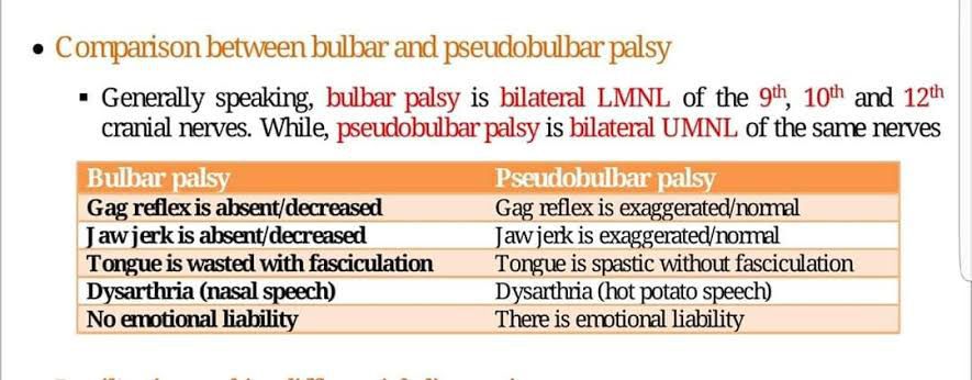 Overview. A bulbar palsy is a lower motor neuron lesion of cranial nerves IX, X and XII. A pseudobulbar palsy is an upper motor neuron lesion of cranial nerves IX, X and XII.