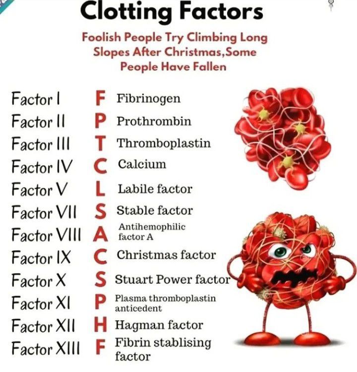 Clotting factors are circulating plasma proteins. The final coagulation product, the clot, results from the interaction of clotting factors through an enzymatic cascade. In vivo, many of these interactions take place on lipid surfaces, the most abundant of which are provided by platelets. Here's a mnemonic to remember these clotting factors.