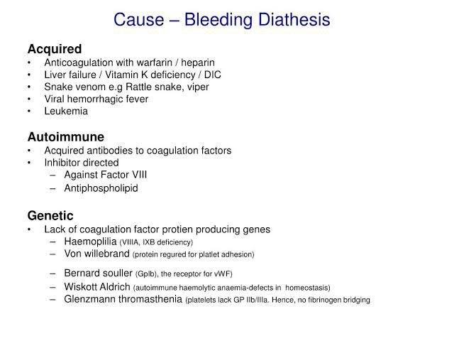 Bleeding diathesis refers to the increased tendency to bleed or bruise. Bleeding diathesis may result from acquired or congenital causes, most of which result in an impaired clotting process.
