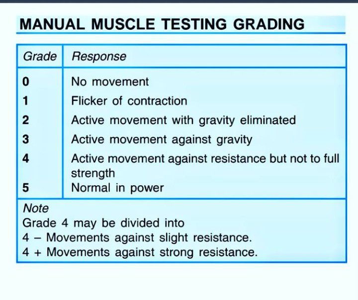 This table in list five grades of manual muscle testing or MMT. By: https://www.instagram.com/p/CbmOVYqoK7L/?utm_medium=copy_link
