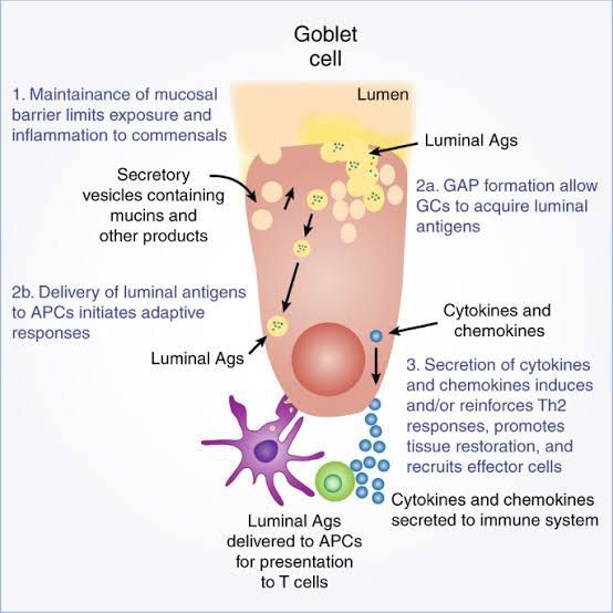 Goblet cells are a specialized type of epithelial cell that secrete mucins (any of the class of glycoproteins found in mucus e.g. saliva, gastric juice, secreted by mucous membranes) which are significant components of mucus.
