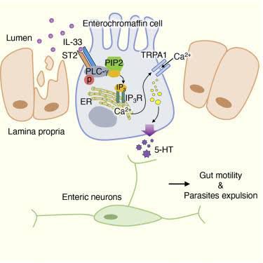 Enterochromaffin (EC) cells (also known as Kulchitsky cells) are a type of enteroendocrine cell, and neuroendocrine cell. They reside alongside the epithelium lining the lumen of the digestive tract and play a crucial role in gastrointestinal regulation, particularly intestinal motility and secretion.