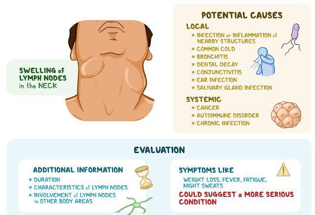 Cervical lymphadenopathy is abnormal enlargement of lymph nodes (LNs) in the head and neck usually >1 cm. Most cases are benign and self-limited, however, the differential diagnosis is broad. Malignancies, infections, autoimmune disorders, iatrogenic, and other miscellaneous conditions are considered as the causes for cervical lymphadenopathy. Unexplained cervical lymphadenopathy is a cause of concern for physician and patient because sometimes it could be the manifestation of an underlying malignancy. Some signs and symptoms are: A painful, warm, or red lump under your skin. More tired than usual. Skin rash. Unexplained weight loss. Enlarged spleen (organ that filters blood) Fever or night sweats