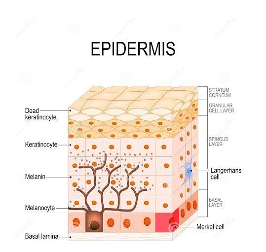 Your skin has three main layers, and the epidermis (ep-uh-derm-us) is the outermost layer in your body. The other two layers of skin are the dermis and hypodermis. The epidermis is the thinnest layer of skin, but it’s responsible for protecting you from the outside world, and it’s composed of five layers of its own. Each layer of your skin works together to keep your body safe, including your skeletal system, organs, muscles and tissues. The epidermis has many additional functions, including: Hydration. The outermost layer of the epidermis (stratum corneum) holds in water and keeps your skin hydrated and healthy. Producing new skin cells. New skin cells develop at the bottom layer of your epidermis (stratum basale) and travel up through the other layers as they get older. They reach the outermost layer of your epidermis after about a month, where the skin cells shed from your body as new cells develop at the bottom layer. Protection. The epidermis acts like armor to protect your body from harm, including ultraviolet (UV) radiation, pathogens (bacteria, viruses, fungi and parasites) and chemicals. Skin color. The epidermis has cells called melanocytes which make melanin, which is a group of pigments in your skin that provides skin color.