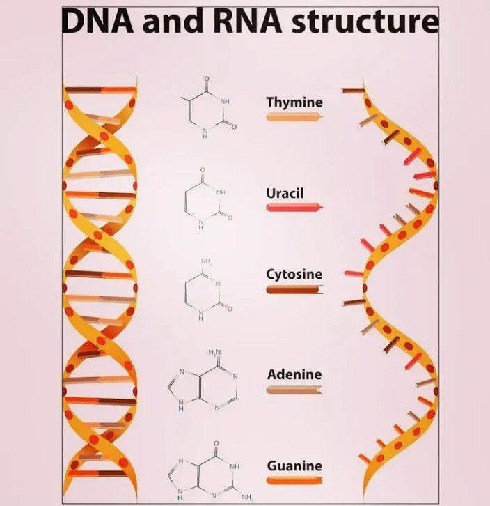 There are two differences that distinguish DNA from RNA: (a) RNA contains the sugar ribose, while DNA contains the slightly different sugar deoxyribose (a type of ribose that lacks one oxygen atom), and (b) RNA has the nucleobase uracil while DNA contains thymine.
