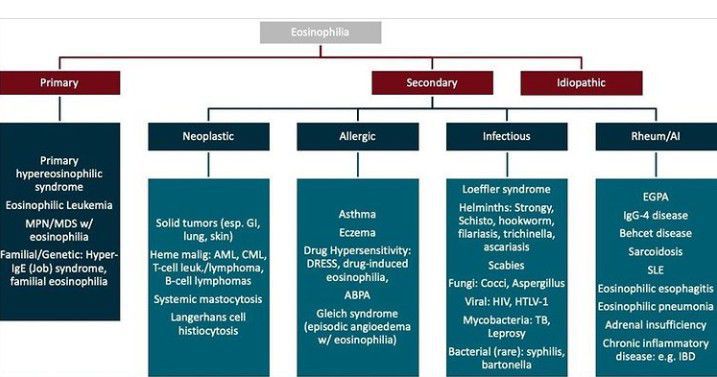 Eosinophilia is a higher than normal level of eosinophils. Eosinophils are a type of disease-fighting white blood cell. This condition most often indicates a parasitic infection, an allergic reaction or cancer.