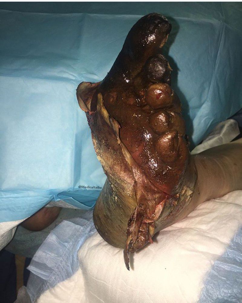 This is the foot of a 57-year-old male with a past medical history of type 2 diabetes mellitus, hypertension, alcohol abuse, significant tobacco abuse, and depression. He said that he has been living in the woods and homeless and staying at friends places when he could. His foot started hurting about 4 months ago but he just thought it was his diabetes. He doesn’t have any extra clothes so he just keeps his socks on and really hasn't looked at his feet in 4 months according to him. He also was rendered immobile and unable to walk on it secondary to pain. At presentation he was septic with necrotizing fasciitis. His foot literally smelled so bad they had to put a fan outside his room to blow the smell back in his room with air fresheners all over. Necrotizing fasciitis is a life-threatening, rapidly progressive subcutaneous soft-tissue infection that may extend to the deep fascia, but is superficial to muscles, and is accompanied by secondary necrosis of subcutaneous tissue. It is referred to as the "flesh-eating infection/bacteria", commonly caused by anaerobic bacteria or group A streptococci (pyogenes), but it can be a polymicrobial infection with both aerobic and anaerobic organisms too. The infection typically enters the body through a break in the skin such as a cut or burn. Clinical manifestations include sepsis and fever with an area of erythema. When progressed, the tissue begins to turn necrotic and into gangrene, which appears gray/black. It spreads quickly and aggressively from the primary infected area and beyond and can result in amputation, shock, and death if not treated by a combination of surgical exploration, debridement (removing necrotic tissue), and appropriate antibiotic therapy.
