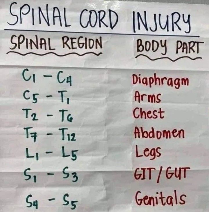 This post simply mentions the affected body part if certain spinal cord regions are injured.