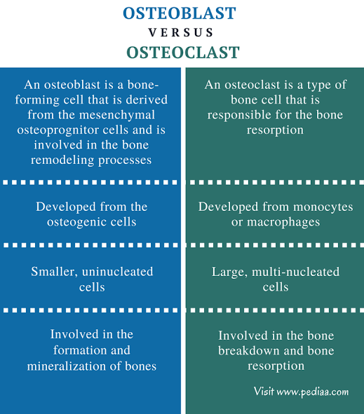 Osteoblasts are the cells that are involved in the bone formation and the mineralization of bones. Osteoclasts are the cells that are involved in the breakdown and resorption of bones. Therefore, the main difference between osteoblast and osteoclast is the function of each type of bone cell in bone remodeling.