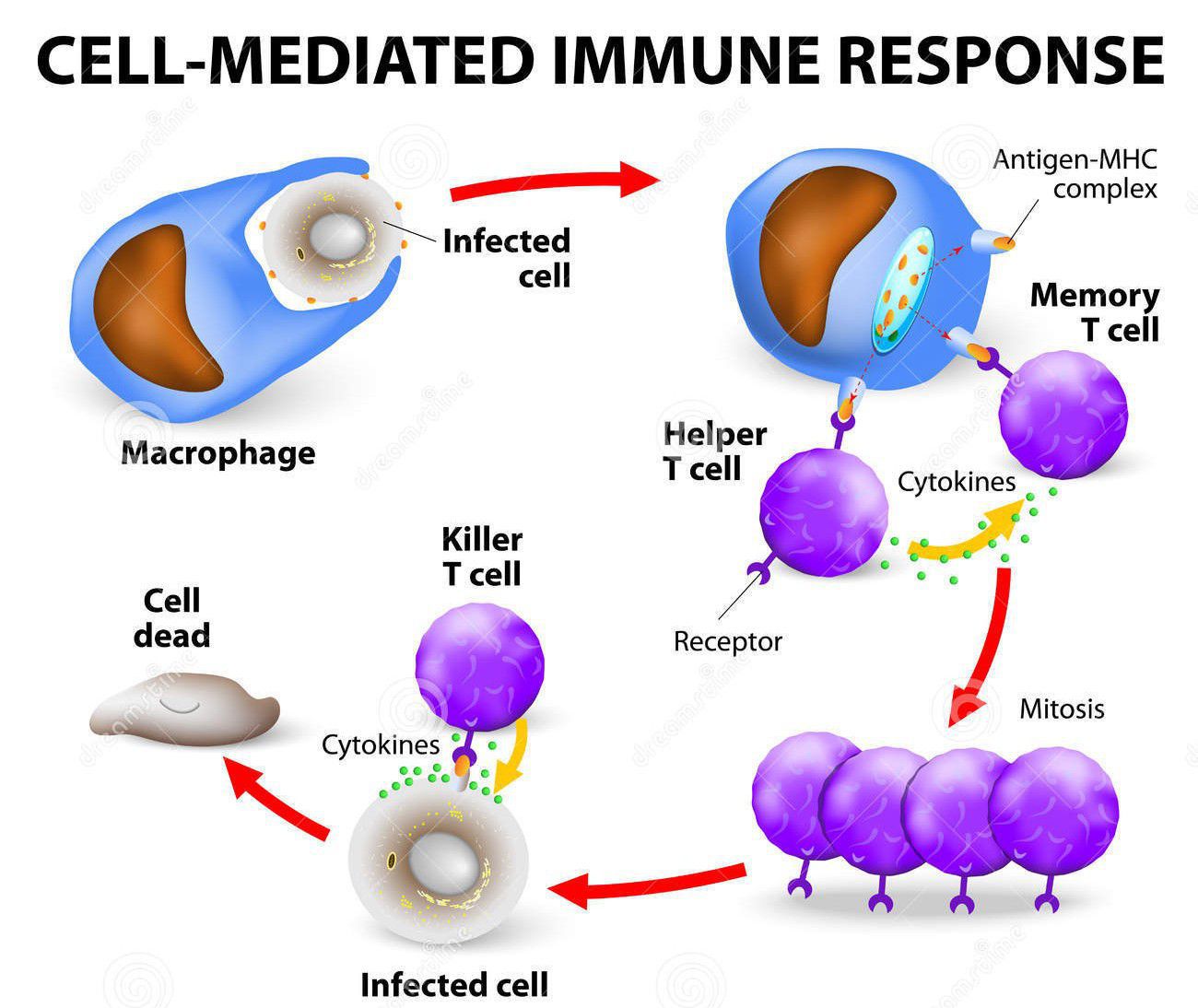 Cell-mediated immunity is an immune response that does not involve antibodies. Rather, cell-mediated immunity is the activation of phagocytes, antigen-specific cytotoxic T-lymphocytes, and the release of various cytokines in response to an antigen. Cell-mediated immunity is primarily driven by mature T cells, macrophages, and the release of cytokines in response to an antigen. T cells involved in cell-mediated immunity rely on antigen-presenting cells that contain membrane-bound MHC class I proteins in order to recognize intracellular target antigens.