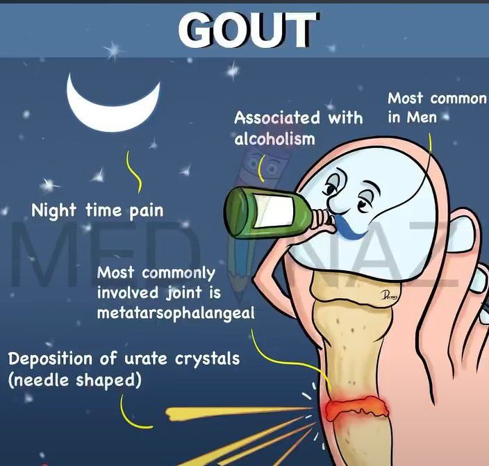 Here is an easy mnemonic to remember the common features of gout. By: https://www.instagram.com/tv/CcdHAWCjn1T/?igshid=YmMyMTA2M2Y=