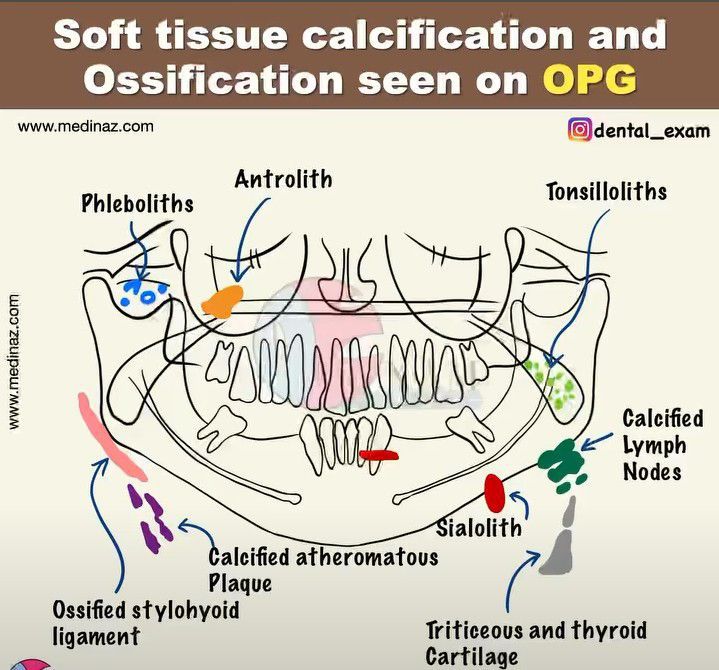 This picture summarises all the soft tissue calcifications and ossifications seen on OPG.