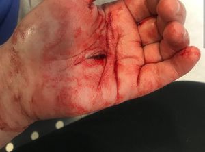 My thoughts are it depends on the artery severed , if its a small brach it might not need vascular reconstruction surgery unless its a large major one. The hand looks pink, can you feel both pulses,how is the ROM, nerves intact ? If all within normal range place sutures under lidocaine & dress wound ,Paracetamol PO for pain ,advice to move the fingers frequently per day, return to ED if any changes show. But Ofcourse most importantly is to call for vascular/hand surgeons consult.