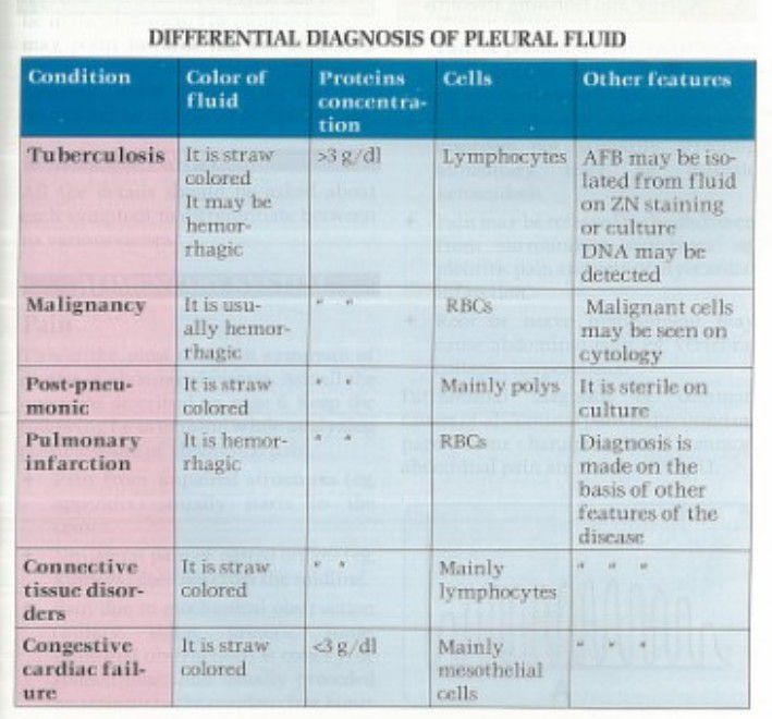 Here the differential diagnosis of pleural effusion is present in a tabular form.