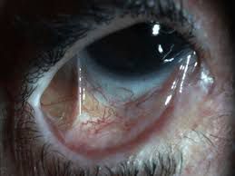 Symblepharon is a pathologic condition where the bulbar and palpebral conjunctiva form an abnormal adhesion to one another. Most cases of symblepharon are acquired, though it can rarely be congenital, as sometimes seen in cases of cryptophthalmos.