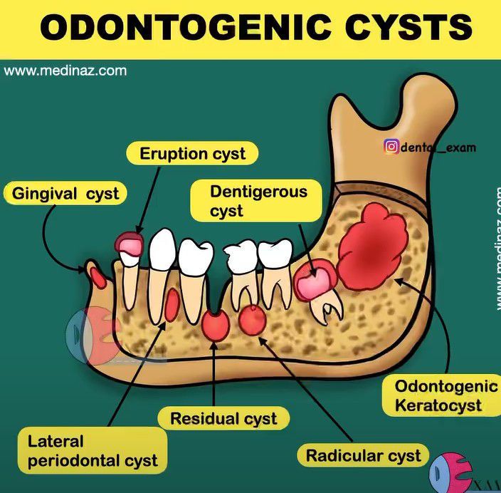 Here is a pictorial representation of different types of odontogenic cysts. By: https://www.instagram.com/tv/Cc5RoLhqJJb/?igshid=YmMyMTA2M2Y=