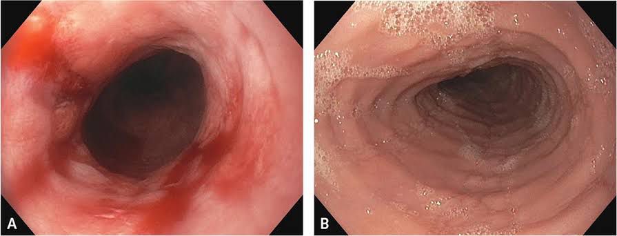 Eosinophilic esophagitis is an allergic condition that happens in the esophagus. The esophagus becomes inflamed and does not contract properly. It can get narrowed and develop rings or abscesses. The symptoms happen when your immune system makes white blood cells in reaction to an allergen.