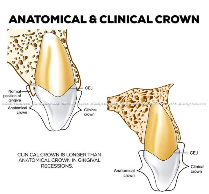 Clinical crown: The visible region of your teeth not covered by your gums, including your visible enamel-covered anatomic crowns and visible root. Anatomic crown: The top portion of your teeth is covered in enamel, including parts covered by your gums.