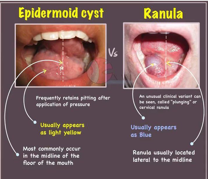Here is a brief comparison of Epidermoid cyst and Ranula. By: https://www.instagram.com/tv/Cc9uMsGD8-x/?igshid=YmMyMTA2M2Y=