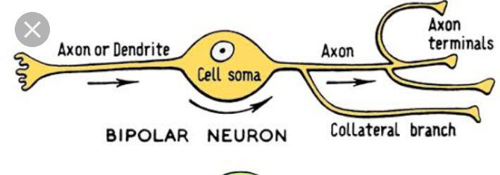 neuron with only two extensions—an axon and a dendrite—that run from opposite sides of the cell body. Cells of this type are found primarily in the retina (see retinal bipolar cell) and also elsewhere in the nervous system. Also called bipolar cell.