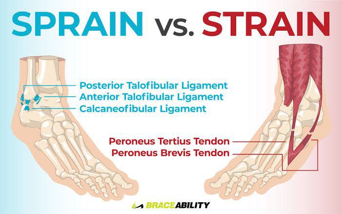 The difference between a sprain and a strain is that a sprain injures the bands of tissue that connect two bones together, while a strain involves an injury to a muscle or to the band of tissue that attaches a muscle to a bone.