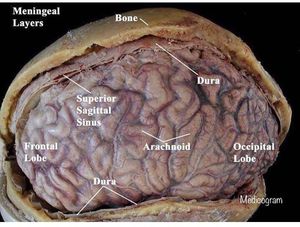 present to you, The Meningeal Layers of the Human Brain! 'Meningeal layers consist of the pia mater, arachnoid mater, and the dura mater! The meningeal layers cover the brain and spinal cord! Main function of the meningeal layers is to protect the brain and spinal cord! . The pia mater is the meningeal envelope that firmly adheres to the surface of the brain and spinal cord.lt is a very thin membrane composed of fibrous tissue covered on its outer surface by a sheet of flat cells which is thought to be impermeable to fluid. The pia mater is pierced by blood vessels that travel to the brain and spinal cord. Over the pia mater and separated from it by a space called the subarachnoid space is the arachnoid, a thin, transparent membrane. It is composed of fibrous tissue and, like the pia mater, is covered by flat cells also thought to be impermeable to fluid. The arachnoid does not follow the convolutions of the surface of the brain and so looks like a loosely fitting sac. In the region of the brain, particularly, a large number of fine filaments called arachnoid trabeculae pass from the arachnoid through the subarachnoid space to blend with the tissue of the pia mater. The arachnoid trabeculae are embryologic remnants of the common origin of the arachnoid and pia mater, and they have the frail structure characteristic of these two of the meninges. The pia mater and arachnoid together are called the leptomeninges. The outermost of the three meninges is the dura mater, a strong, thick, and dense membrane. It is composed of dense fibrous tissue, and its inner surface is covered by flattened cel|s like those present on the surfaces of the pie mater and arachnoid. The dura mater is a sac that envelops the arachnoid and has been modified to serve several functions. The dura mater surrounds and supports the large venous channels (dural sinuses) carrying blood from the brain toward the heart.
