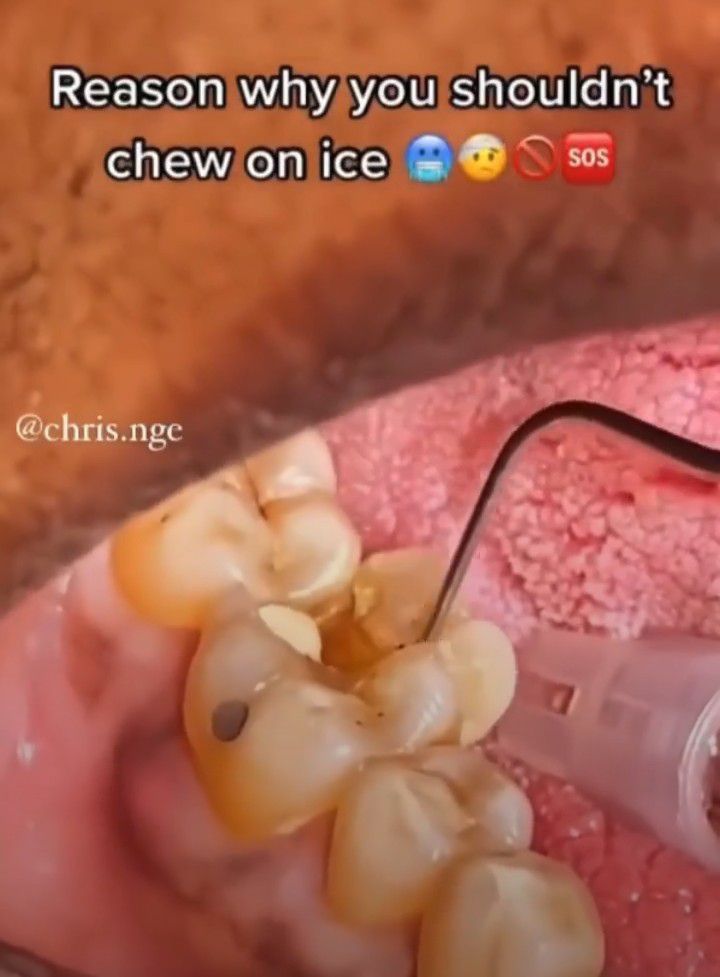 .An existing restoration with secondary caries was the main cause of the fracture. Chewing an ice cube was the triggering factor. Chewing ice is a big no no, as it can get very addictive and possibly damage your teeth. So why put yourself at risk? By: https://www.instagram.com/reel/CdMNUAEjq-4/?igshid=YmMyMTA2M2Y=