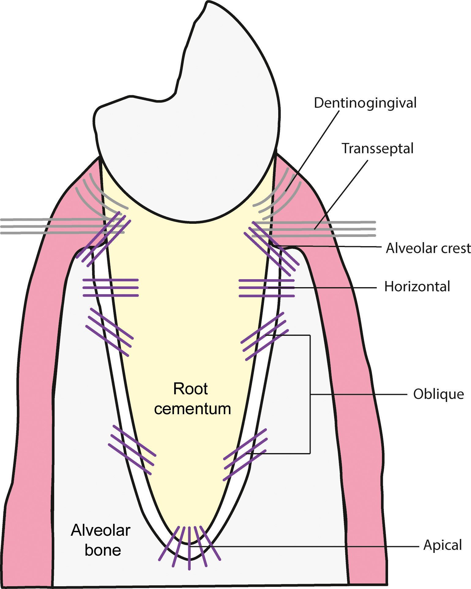 The primary principal fiber group is the alveolodental ligament, which consists of five different fiber subgroups. These fiber subgroups include the following: alveolar crest, horizontal, oblique, apical and interradicular on multirooted teeth.
