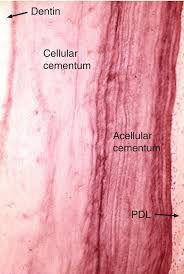 Acellular cementum is the thin, mineralized tissue covering the cervical portion of the tooth root, important for attachment of the periodontal ligament (PDL) to the root surface.