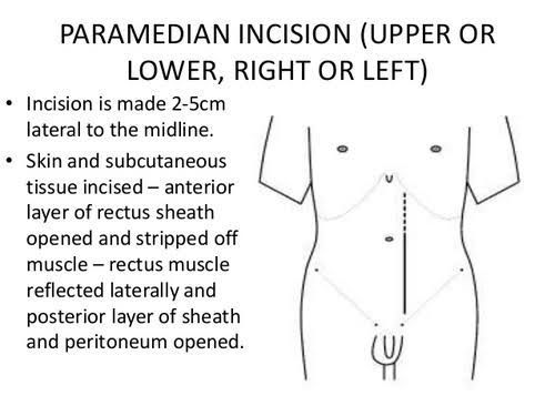 Paramedian incisions: These incisions are made 2-5 cm beside the midline of the trunk on your abdomen (belly). It provides access to tummy structures such as the stomach, liver, and spleen.