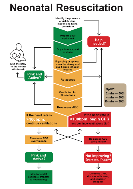 1 - Stimulate the neonate by drying Tactile stimulation can trigger spontaneous breathing. It is done by drying the neonate. If the neonate starts to breathe or cry within 5 seconds, proceed to routine care (Section 10.1). If not, stop stimulation and proceed to step 2. 2 - Clear the airway Lay the neonate on the back with the head in a neutral position (Figure 10.1); avoid flexion or hyperextension of the neck, as this can obstruct the airway. 3 - Stimulate the neonate Rub the back and the soles of the feet vigorously but not roughly (do not shake, slap or hang the infant by the feet, etc.). If the neonate is having difficulty breathing or still not breathing after 5 seconds: stop active stimulation, and proceed to steps 4 and 5. 4 - Clamp and cut the cord If not already done, clamp and cut the cord. 5 - Perform bag-mask ventilation (room air) Fit the mask over the nose and mouth. Press firmly to prevent air leaks. Hold it with one hand, with the thumb on one side and the index and middle fingers on the other (Figures 10.2 and 10.3). With the other hand, squeeze the bag at a rate of 30 to 60 breaths/minute for 60 seconds. Ventilation is effective if the chest rises and falls. Attention, excessive ventilation pressure can cause a pneumothorax. If the chest fails to rise: – Check the connection between the bag and the mask; – Correct the position of the mask on the face; – Correct the head position. 6 - Oxygenation If oxygen is available: connect the ambu bag to an oxygen reservoir after 2 minutes of ventilation, setting it at a 2 litres/minute flow rate. Ventilation is a priority and should not be interrupted to connect the oxygen (have an assistant connect the oxygen). Stop resuscitation if the neonate has: – No heart rate after 10 minutes. – No spontaneous respiration after 20 minutes of effective ventilation, even if the heart rate is adequate.