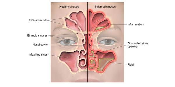 Sinusitis is an inflammation of the sinuses that can cause them to get blocked and filled with fluid. It is usually caused by cold or allergies. An infection could result from the blockage.
