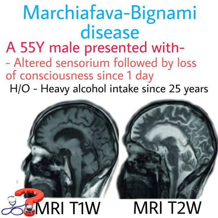 It is a rare neurological complication of chronic alcoholism, with pathognomonic hallmark of corpus callosum demyelination⠀ ⏩The main pathologic changes include symmetrical demyelination and necrosis of the central part of the corpus callosum, with relative sparing of dorsal and ventral layers. ✅Rarely, other structures of the CNS like optic chiasm and tracts, putamen, anterior commissure, cerebellar peduncles and, cortical gray matter and U fibers may be involved ⏩The corpus callosum appears hypoattenuated on CT, The corpus callosum appears hyperintense on T2-WI, hypointense on T1-weighted images and proton density-weighted MR images during the acute phase ⏩The recent clinical and neuroradiological classification - ✅Type A: acute to subacute onset of consciousness impairment, pyramidal tract signs, limb hypertonia, seizures, hyperintense swelling of the corpus callosum on T2-weighted MR sequences and is associated with poor prognosis. ✅Type B: normal or slightly impaired level of consciousness, dysarthria, gait disturbance, signs of interhemispheric disconnection and hyperintense lesions on T2-weighted MR sequences partially involving the corpus callosum. It has favourable prognosis. ⏩In this case diagnosis was made on the basis of chronic alcoholism and radiological features showing characteristic sandwich sign which are seen as low signal intensity in T1WI, high signal intensity in T2WI ⏩It may present in various clinical forms. ✅Acute disease may present with seizures, impairment of consciousness, and rapid death. ✅Subacute disease present with variable degrees of mental confusion, dysarthria, behavioral abnormalities, memory deficits and impairment of gait. ✅Chronic disease, is characterized by mild dementia which is progressive over years. ⏩Treatment is usually empirical and consists of multivitamins, corticosteroids, stabilization of plasma glucose, and supportive care. Early diagnosis and prompt treatment are critical in reversing the early stage of the disease. By: https://www.instagram.com/p/CapALsKBU7S/?igshid=YmMyMTA2M2Y=