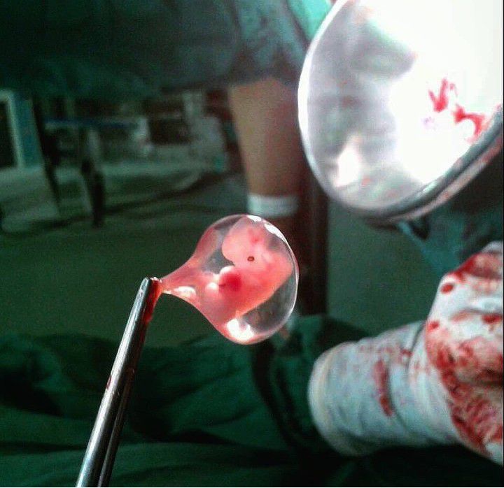 The smallest little embryo with its amniotic sac! How many weeks old is it in your opinion? This is a case of a miscarriage (or spontaneous abortion), which is the spontaneous loss of a fetus before the 20th week of pregnancy, or in this case even before the 12th week. Keep in mind that miscarriage is a naturally occurring event due to some complications and has nothing to do with medical or surgical abortions, or any interruption of the pregnancy! The common reasons pregnancies miscarry are chromosome problems, abnormal physical development or an abnormal placental development. Other causes can be infections, uterine problems, diseases of the mother (diabetes, lupus, thyroid disease), trauma, and unhealthy lifestyle (obesity, drug and alcohol use). The photo shows the embryo still with its intact amniotic sac and umbilical cord. The tiny black dot is the developing eye, and the reddish tissue in the center is the heart.