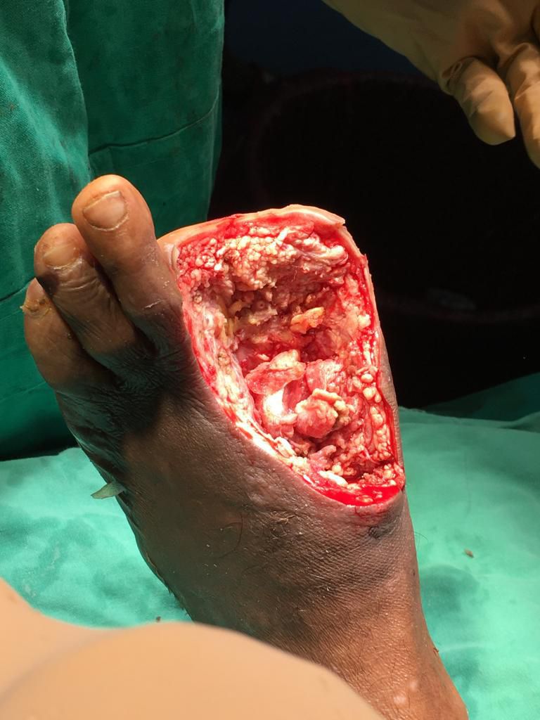 A patient came in to OPD few days back with high blood sugar levels and a part of foot necrosed to the extent that it could not be saved. He was adviced to go for amputation of the necrosed part so the infection does not involve the normal foot. Amputation was done successfully.