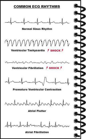 A normal ECG is illustrated above. Note that the heart is beating in a regular sinus rhythm between 60 - 100 beats per minute (specifically 82 bpm). All the important intervals on this recording are within normal ranges.