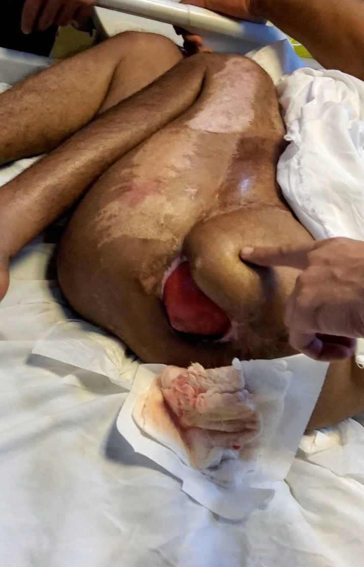 Pressure sore grade 4 . noticing the great trochanter is visible. this patient is paraplegic and the choice of treatment is full thickness flap to cover the exposed area