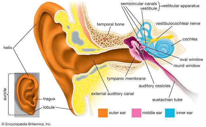The outer ear consists of skin and cartilage, called the auricle, or pinna, and the ear canal. The ear drum, or tympanic membrane, is a thin membrane that separates the outer ear from the middle ear. The middle ear is an air-filled chamber containing three small bones called ossicle