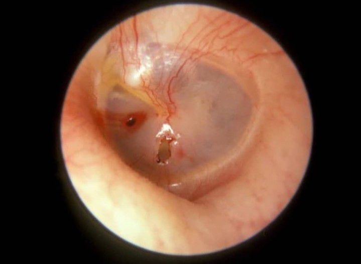 Here is the picture of ruptured eardrum of the ear. It occurs as a result of loud sounds like explosion or any foreign objects in the ear.
