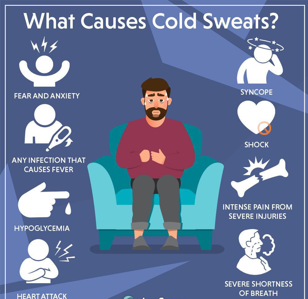 Cold sweats happen when you suddenly feel a chill in your body that occurs alongside abnormal sweating, regardless of how hot or cold it is in your environment. Cold sweats commonly appear in your: palms. armpits