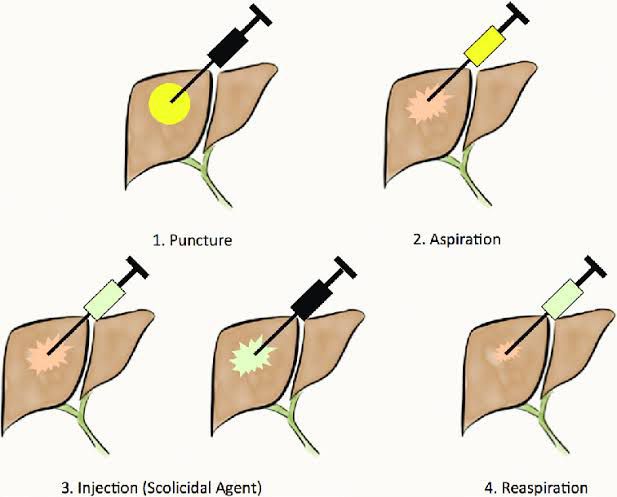 The PAIR technique is performed using either ultrasound or computed tomography (CT) guidance, involves aspiration of the cyst contents via a special cannula, followed by injection of a scolicidal agent for at least 15 minutes, and then reaspiration of the cystic contents. This is repeated until the return is clear.