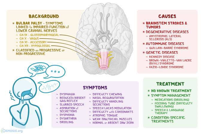 Bulbar palsy is a set of conditions that can occur due to damage to the lower cranial nerves. Clinical features of bulbar palsy range from difficulty swallowing and a lack of a gag reflex to inability to articulate words and excessive drooling. Bulbar palsy is most commonly caused by a brainstem stroke or tumor.