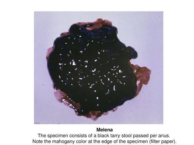 Melena is the most common presenting symptom of major gastrointestinal hemorrhage. About 90% of quantitatively important gastrointestinal bleeding episodes occur from sites above the ligament of Treitz. Melena usually means bleeding from this location. Melena usually occurs as a result of an upper gastrointestinal bleed (rarely it can be due to bleeding in the small intestine or ascending colon). Upper GI haemorrhage has a number of causes, the most common of which are peptic ulcer disease, liver disease, and gastric cancer.