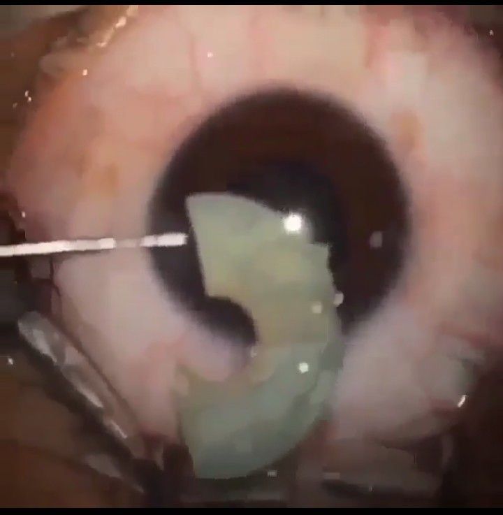 Iris implant surgery was developed to treat people who have an iris that did not develop normally (for example in conditions such as aniridia or coloboma) or who lack a natural iris, most commonly seen after traumatic injury to the eye. It is also performed to permanently change the color of one’s eyes, which is still a controversial reason for performing the surgery. Originally, this patient had iris implant surgery for this reason. . Here, we see the iris implant being removed as a result of complications that occurred because of the implant. The patient reportedly experienced sensitivity to light, red eyes, and floating eye pressure. Other complications that may arise with iris implantation include cataracts, glaucoma, and corneal decompensation. By: https://www.instagram.com/tv/CdyyyhRFFHs/?igshid=YmMyMTA2M2Y=