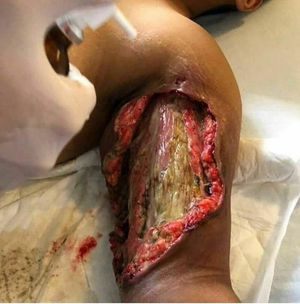 Necrotizing fasciitis, also known as flesh-eating disease, is a rare and serious bacterial infection that can progress rapidly. It can happen if a bacterial infection enters a break in the skin, as a result of trauma or surgery. From there it will spread. Necrotizing fasciitis attacks the deeper layers of skin and the tissues that lie under the skin, called the fascia. It spreads easily through the tissue that covers the muscles and lies beneath the skin. The infection affects muscle and fat tissue as the bacteria release toxins; it can result in shock and organ failure. Necrotizing fasciitis is extremely dangerous, and it has a high fatality rate, between 20 and 80 percent.