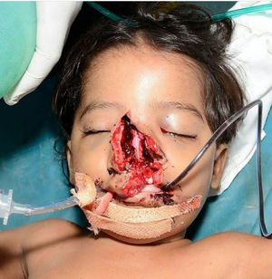 This child fell from the first floor his house and hit his head on an iron gate. Due to profuse bleeding from the injury the airway was secured initially at the time of admission and she was kept on elective ventialation. She was stabilized and underwent a blood transfusion. Primary repair of the facial soft tissues along with reduction of nasal bones and fixation with monocryl sutures was done. Upper and lower nasal cartilages were repaired. Parents were very happy with the end result.