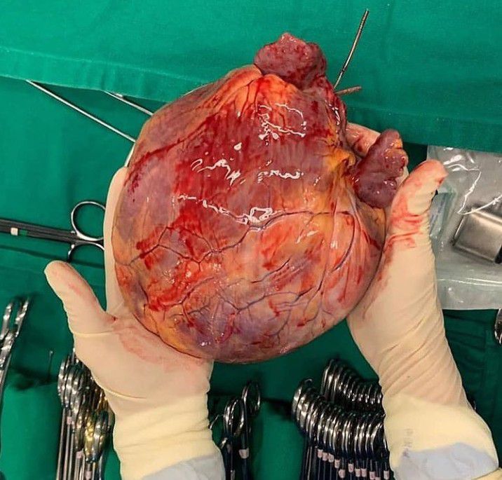 This very large heart has a globoid shape because all of the chambers are dilated. It felt very flabby, and the myocardium was poorly contractile. This is an example of a cardiomyopathy. This term is used to denote a disease where the heart muscle (myocardium) becomes weak and unable to contract with sufficient force (decreased contractility leading to a decreased stroke volume) to provide adequate perfusion (reduced cardiac output) for the cells of the body, but there is no specific histologic finding. Dilated cardiomyopathy is a progressive disease of heart muscle that is characterized by ventricular chamber enlargement and contractile systolic dysfunction with normal wall thickness. The right ventricle may also be dilated and dysfunctional. Patients experience fatigue, dyspnea on exertion, shortness of breath, cough, noctural dyspnea (at night) and orthopnea (dyspnea when lying flat). Diagnosis is made by echocardiogram, which typically shows dilated ventricles with diffuse hypokinesia resulting in a low ejection fraction (I.e. systolic dysfunction). Treatment is largely supportive, and mainly involves the management of symptoms caused by congestive heart failure with ACE inhibitors, beta blockers, angiotensin II receptor blockers and nitrates. Cardiac transplantation is an option for patients with severe heart failure, and a left ventricular assist device, or LVAD, may help to bridge a patient while awaiting transplantation.
