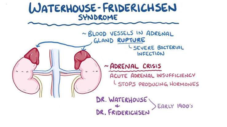Waterhouse-Friderichsen syndrome (WFS) is a group of symptoms caused when the adrenal glands fail to function normally. This occurs as a result of bleeding into the glands. Meningococcemia is a life-threatening infection that occurs when the bacteria Neisseria meningitidis invades the blood stream.